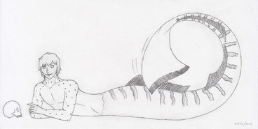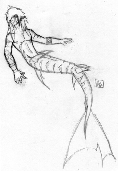 I love his tail - it reminds me of a barracoda, although I have no idea of what a barracoda looks like! On the whole, I think the overall composition of this picture is good - one thing I noticed though, was the arm that is hanging down looks really stiff. Maybe if the elbow was bent a little it would look better - 'coz I don't think that arms naturally fall that straight. There's always a little crook at the elbow. Other then that, you've done a really good job - I like the arm folded over his (hot) abs - it looks really good. Keep up the good work!
