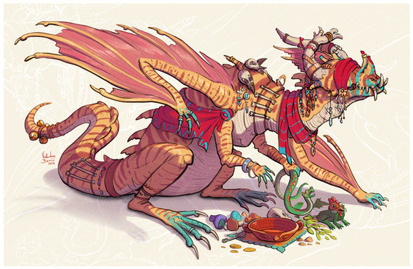 I can't help but love the color scheme, but what is really awesome to me is that you only have sparse areas that have black outlining, and it works really well in creating depth AND value variation. Also, you really nailed that detail work, just enough to be fun to look at without being busy. I love the scenery and the fun creature wearing cool necklaces.
