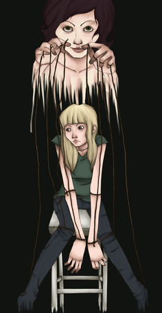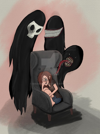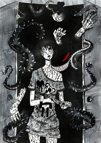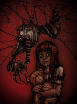 This is a very interesting piece. I am more of a writer than an artist and I can see many different scenarios for this image. The one that stands out in my mind is a young girl who can see the demons who haunt and or control other people and fear that they can see her too.