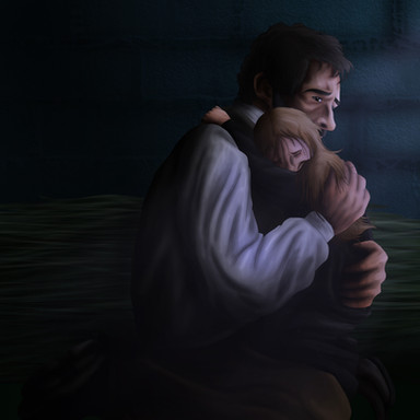 The emotion here is fantastic! I love the frantic, desperate intimacy and also loneliness of their embrace. The single tear down her face is a wonderfully poignant detail. The subtle yet effective use of lighting against a gloomy background here is a fantastic idea. Well done!