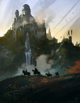 Holy, exquisitely magnificent! This Majestic Landscape is stunning and The Castle looks incredible! The horseman, escort, poses, sky, clouds, birds, architecture, domes, towers, lake, plant life, realisticness, textures, movement, composition, concept, uniqueness, lighting, colors, style, and other details are also wonderful! Amazingly beautiful work!