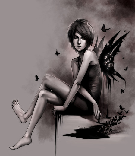 What an interesting piece. The lighting and the shading are quite remarkable, and that faraway look in her eyes, despite the tears...what a blatant contrast of emotions. And I must say, the attention to detail regarding the cracks on her legs, why, it's simply incredible! Also, the way you managed to capture the border between madness and despair in the pictures on the wall....what a magnificent piece.