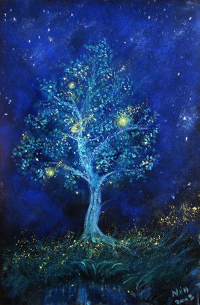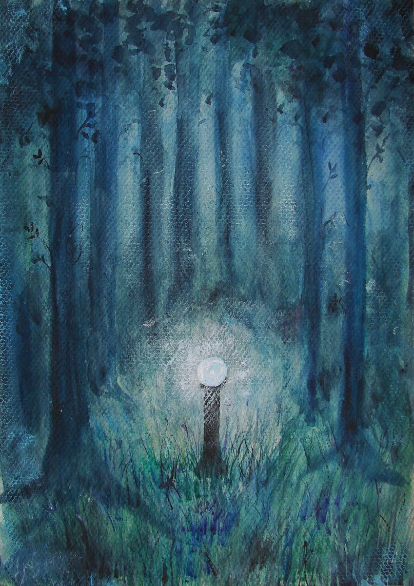 At first I was going to make moon more stylized and with mandala-like pattern on it, but during the process I decided against it, I like it the way it is now, lotus pattern I choose earlier would've been a bit too much, especially when after painting water, I realized this piece will fit my inner Space Forest glimpses Oh, and indigo worked so well for this piece, for water and grass as well (I know grass looks black, but it's indigo - I don't use plain black paint anymore in paintings, only in craft and design projects etc