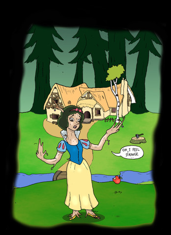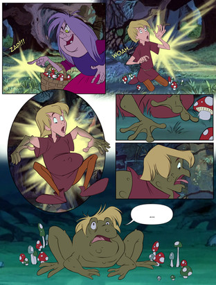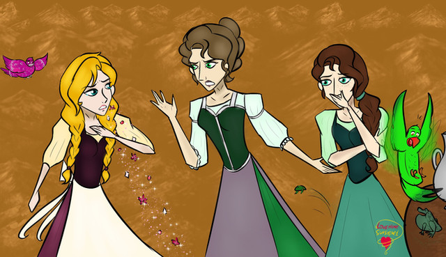 The colours are unusual but they work this time! I love the use of green and the mountains and the sky are beautifully done even though if it was me I'd have finished the mountain line! The princesses are accurate. As frogs some of the fingers should have been chunkier but it works because they could be in that 'shifting' process. The expressions are also accurate and meaningful too. All in all I enjoyed this piece, not quite sure which character the one in blue is supposed to be in case it's some sort of demon in which case it works! Well done!