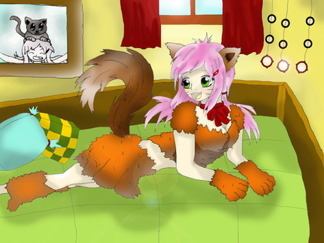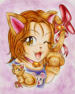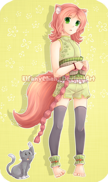My entry for 's contest. This is her Neko OC Kimiko.I used brighter colors than she usually uses, so I hope I got them right! I added the random retarded sad Koi fish to make it look more authentically cutsie.