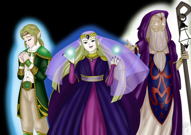 A couple other things I want to mention about the artwork: the Well represents the pupil in the Eye of Truth symbol, perhaps to signify how the Sheikah perceive the world of the restless spirits around them. Restless or evil souls (colored blue as a little tribute to Twilight Princess) who cannot heal enter the well. You might wonder what happens to them down there, but think about it: there's a Green Bubble down in the bottom of the well. Ever wonder why the skull of a Bubble is flaming, or why in Zelda games they seem "possessed", can spring to life suddenly, and even curse you? ...Well, now you know! I think that sounds rather like a restless spirit, don't you? The lyre is also based off Sheik's lyre and the male Sheikah wears the symbol of the Sage of Shadow/Shadow Temple. The three Sheikah in the background wear the Mask of Truth.