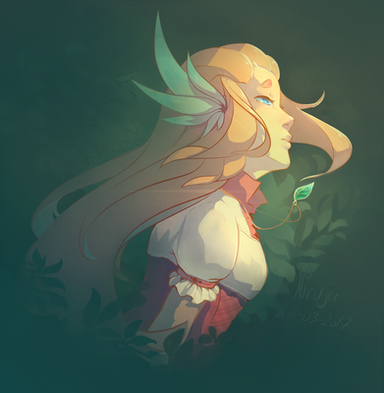 Originally she was supposed to be a spirit of nature (since this painting is loosely based on an older one) however, once I got to the details I changed it to an elf since it fit the image. I'm glad that you still got this type of mood from the image.