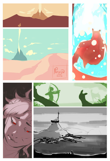 I also included the thumbnails I did for my Howl's Moving Castle fanart and also some in progress images from the painting I'm currently working on (the one with the dragon). If one of you has some advice on how to improve the image I'd love to hear it.