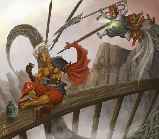 Vabbé, io sono ossessionata da Tetsuya, ma il tuo è davvero spettacolare, con la spada tra i denti, le braccia ferite e la determinazione stampata in faccia. E bellissimo anche il demone, con quei capelli che danzano nell'aria, fa davvero paura.