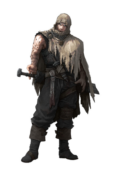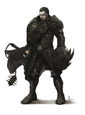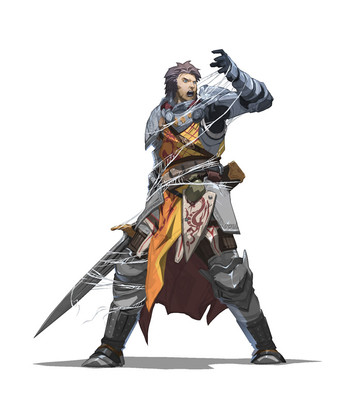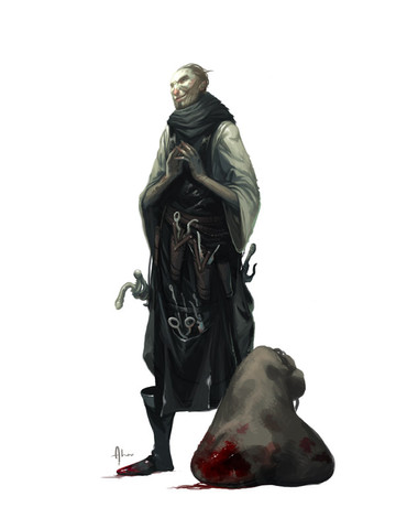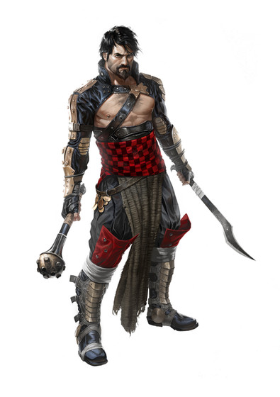 Another char design for Pathfinder Issue #7"This guy is a tall man with close-cropped black hair, a sly smile, and bright blue eyes. He wears black leather armor with a steel spider-shaped baldric, and a thick chain crisscrossing his chest linked in the shape of a spiderβs web. Several fat black spiders crawl over his body and he wears a wrist- mounted pair of jagged blades (punching blades) that arch over his fist and drip with poison."