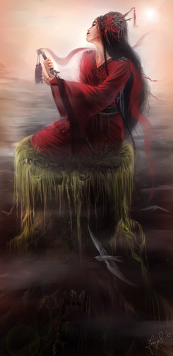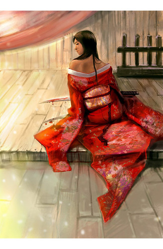 red maple,just like her beautiful name,when she brandishing her blade,her action seems as elegant as a red maple leaf.no one knows where was she come from. people just know she is a samurai's daughter,a secret girl with three blades.a tentative work in ps,cost 3-4 hours to painter,hope you like it. red,red,red