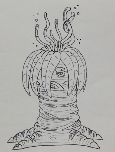 Plotts are small aliens native to the moon Skurrow, which orbits a large desert planet. Skurrow has a higher gravity than on earth, a very thick, oxygen-rich atmosphere and is teeming with life. Hundreds of species of plant-like organisms cover the moon’s surface. Some Skurrowian organisms play the parts of animals and plants alike. One of these is the plott, a small creature reassembling a cross between a pot plant and an octopus. Seven pairs of compound eyes constantly scan the forest for threats or food. The plott’s cylindrical body is roughly one meter in diameter. From around the plott’s top grow eight broad arms which serve as “fruit” collectors and photosynthesisers. The robust body is supported by six thick legs which have evolved to cope with the plott’s endless journey through the swamps of Skurrow. The front pair of the ancestral eight legs have evolved into strong grasping organs, and are always in motion: grabbing small animals, scratching tuber-like plants out of the ground, or plucking fruit like parts from pseudo-trees. Picked food is placed directly into the intestines through a slit under the body. Because food is so plentiful on Skurrow, its inhabitants can afford to waste food or have quick metabolisms. The plott is no exeption. Plotts don’t not require sleep; the sunlight they filter in from their leaf-like top arms gives them the energy needed for the plott’s eternal movement. The plott is about as intelligent as an octopus and thinks like an ape. It is capable of solving difficult problems; mainly ones that have to do with getting at food.Pencil on paper