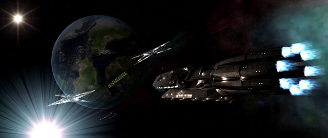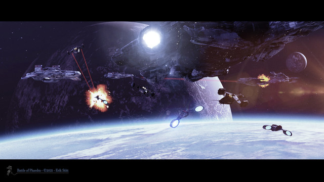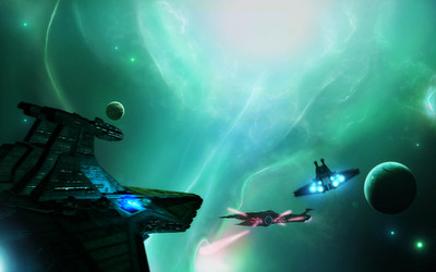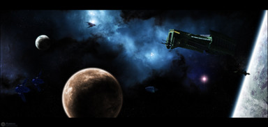 The planet, stars, and nebulae in the background we're done solely in Photoshop. The ships were initially pencil sketches, which were later scanned and completed in Photoshop.