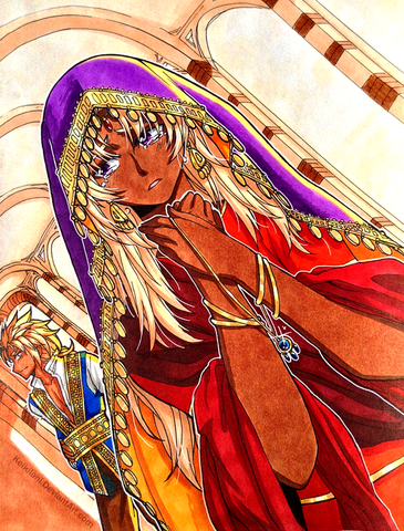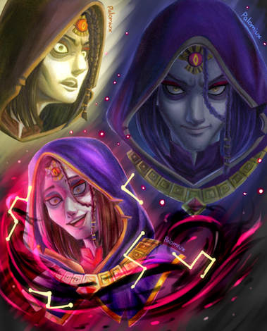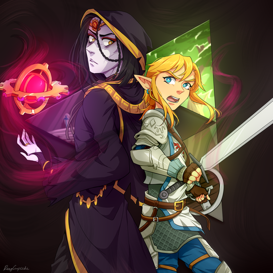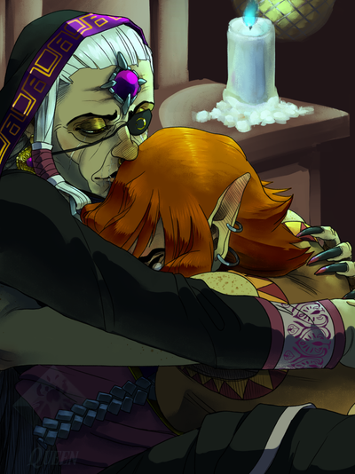 (Smile)"/> The overall effect has quite the impact. I really love the mix of colours going on here, from the cool dark tones to the warm bright tones. I would say that the colours are in perfect harmony here. Furthermore, I think it's really interesting that you alternated colours with the outlines surrounding them, it somehow adds a "whimsical" feel to the piece. The added soft glows and particles of light really help emphasize that whimsy too! One thing I really love about the artwork is how you kept a large amount of proportions in tact, for instance, I would say you drew the spike on the elderly Impa's cape/ hat thing at the perfect height relative to her body! I really love the attention to details too, like in the older Impa's "pendulum braid" and in their clothing overall.