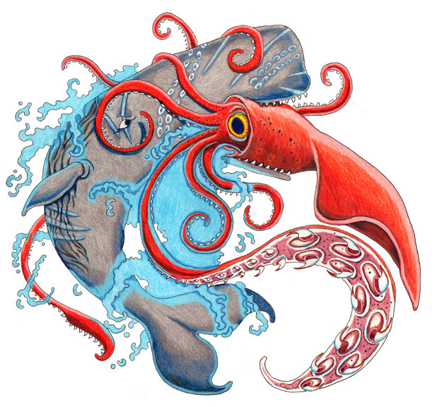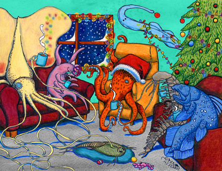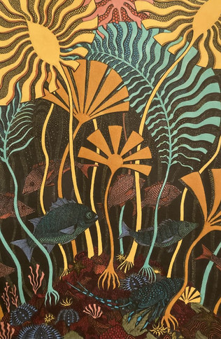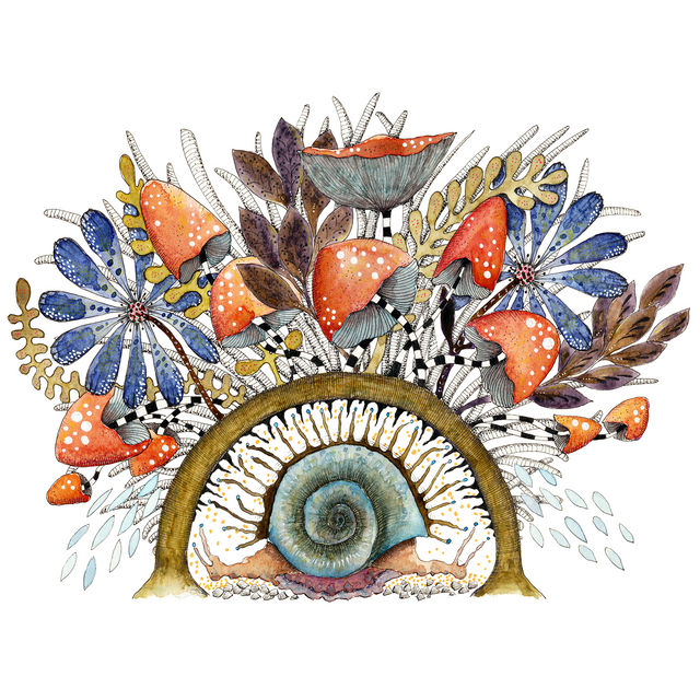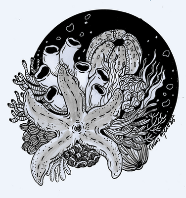 As the tide recedes on the rocky New England coast, some of the water remains trapped in pits and crevices. These pools provide a haven for many organisms, though they have to be tough to survive in this environment. The sun’s direct rays quickly heat the pools, affecting both temperature and the oxygen content since warmer water holds less oxygen than cold. The salinity of a tide pool also changes rapidly—evaporation concentrates salt in the water, but heavy rain or runoff from land may strongly dilute it in under an hour.Despite all these obstacles, many seaweeds grow primarily in these pools because the space on the stones directly exposed to the open sea is taken up by thick, rubbery wrackweed (the yellow-brown Y-shaped leaves surrounded this drawing). These pools also provide homes for animals that could not survive the constant pounding of the waves against the exposed rocks nor consume the thick, rubbery flesh of wrackweed.
