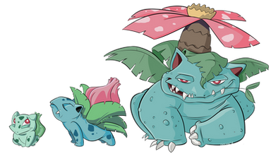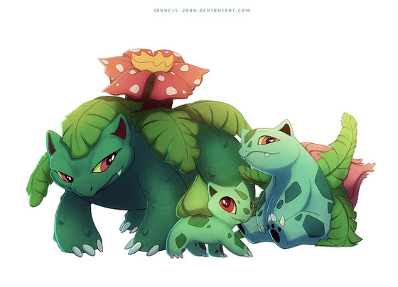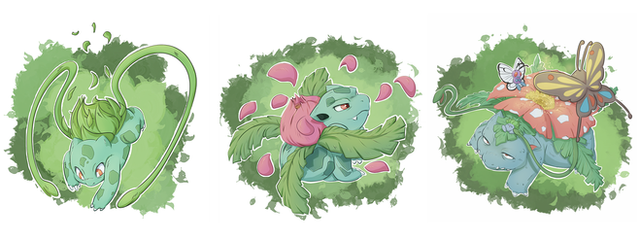 Doing them one by one is propably faster, because I sometimes have to wait ridiculously long time to finish the whole evo line before I can post it. But I personally like posting evo lines together. Venusaur is quite much older than bulbasaur and ivysaur so it looks much different apart from those two. Bulbasaur and ivysaur are so tryhard-dynamic-etc. while venusaur is just dozing off, probably dreaming of fast food.