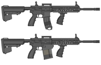 EDIT: Thicker, sloped buttstock. Charging handle moved to above the QR handguard.