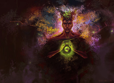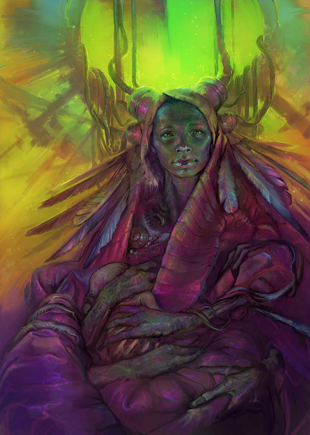 Those things on her neck are feathers - though I did think of painting scales at some point. I'm going to try to make them look softer in the final render. Everything on the right side of the image will be taking animal shapes or reference animal features - flora on the left, fauna on the right, that is my plan. I'd like to make these elements look rough, even abstract (they're her creations, after all), while rendering the focus (face and tree) more accurate, realistic and polished. I don't know how to make it work, but I'm trying new solutions and looking for inspiring galleries.