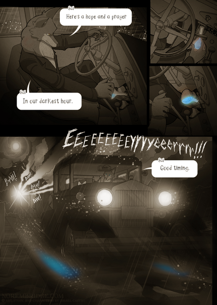 Being a good samaritan Salvatore offers to give the stranded faceless fox a ride. Although perhaps a bit to a reluctant dismay from Fright who now may find himself sharing the backseat with this glowing eyed skull headed individual. The "click" of a door handle shuffles open as the fox leers inside before taking his seat down dripping wet with the rain and seawater.