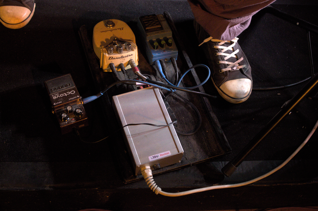 -Boss NS-2 Noise Suppressor. Looped once through the clean signal and again through distortion, this thing gives peaceful silence in between notes where there would normally be squealing, hissing, popping, locking and dropping it. A handy little tool with very responsive controls.