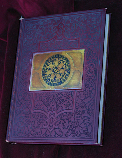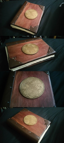 Leather bound tome for LRP. Internal illustration shows a stylised rendition of the world tree. Not show here the book also has a leather carrying strap so it may be worn slung from the shoulder.I did all the work on this, pages were cut from a roll then complied with five bolts. Page edges were then trimmed for neatness and coloured with inks. Cover is wood bound with leather, relief applied beneath.