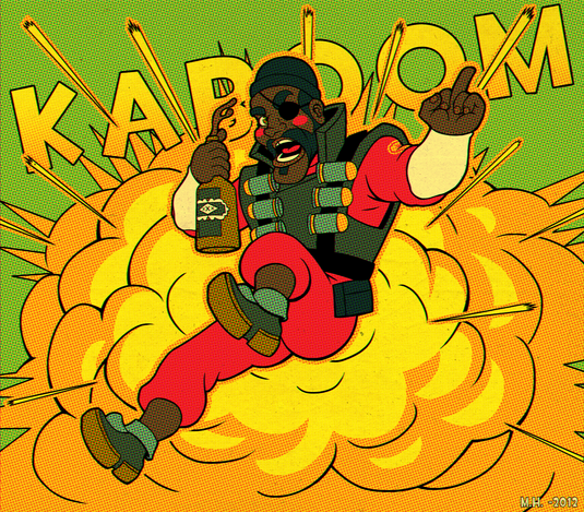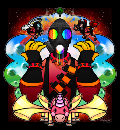 This started out as my third attempt to re-learn Adobe Illustrator, but you know what, screw that program! Ok but maybe it wasn't the best motif or idea to work with when I'm so inexperienced and my "skills" are so unrefined. I've recieved the question "is that made in illustrator?" quite a few times, and I though that maybe I should learn how to make vector graphics since my style apparently already look like it and vectors got a few perks that pixels don't. Problem is though that I'm now pretty sure my "style" rely on several fuctions and tricks Illustrator don't have. Also, I kinda hate how Illustrator got so many icons, names and keys that are identical to Photoshop except that they mean/do something completley different, trying to make sense of all functions in Illustrator is a damn nightmare if you're already used with Photoshop.ย Anyway, back to this picture, I atleast got some nice basic lineart from using Illustrator, it helped with all the smooth shapes, however all line weight was added in Photoshop (a long with everything else). Despite everything, maybe I'll go back to Illustrator next time I have a motif with a lot of smooth shapes.ยAbout the motif itself, yes it's from Team Fortress 2.