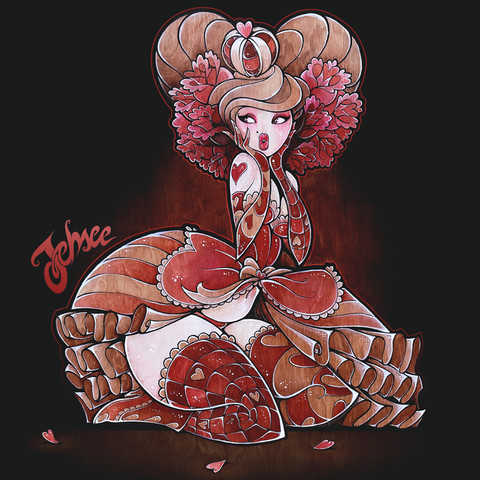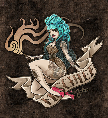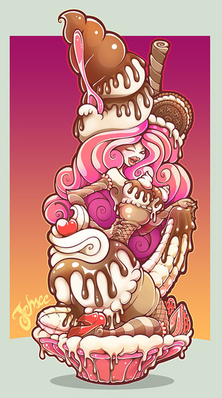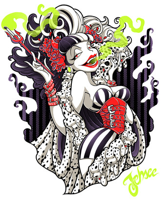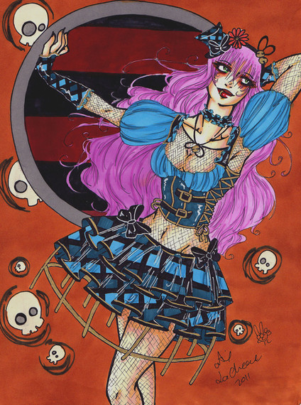 I love the combination of the frilly candy colors and the skulls. Very clever. She's cute but also insidious in a way. Great job on her stylized anatomy, her hair, her pose, everything! This thing came out awesomely.