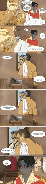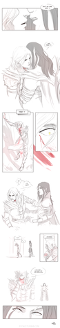 I'm actually so glad you drew your take on this scene, I love your style and this is the scene that actually made me really empathise/sympathise with Fenris' character and ultimately made him my favourite one. Your take on the female Kossith is absolutely beautiful, I really love her design, she looks strong yet incredibly wise and the shift in styles at the end is very hard hitting emotively. Most of all, I really think you captured the main thing that I got from the scene where he talks about his past, which is the sense of freedom and happiness he gained for the first time, that was then just destroyed by a feeling of hopelessness, where he's merely told, not even forced, to kill them all.