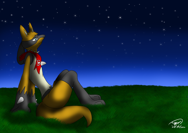 my my! nice to see a yellow lucario for once in while! awesome gift artwork for Yote-fang Dripy! as much as the facial expression confused me at first i thought it was very adorable with the half closed eyes and the wavy lip, one which you don't see much. As for the background I could tell the trees and stars were photographed and the stone ledge was painted and I must say it was very excellently painted with the shading, defiantly giving us that rocky and rugged look while some parts do smooth out. speaking of shading, I did find it very odd that the part of the tail poking out between the left hand and the waist being un-shaded very strange since where the light is coming from this part of the tail should be shaded. but besides form that the shading just like in Dancing in Cinders with the burring to show curve and no-blurr to show no curve has proven to be very charming indeed and very useful at giving us the depth and 3D look of the character. well done Dripy! ^^