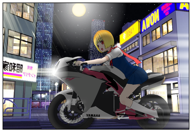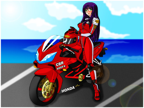 I've been wanting to see Natsuki riding a YZF-R1 since long ago. It's mainly because I think her bike (in Mai-HiME) looks so outdated and somehow fits better in a museum than on streets. It's true that there's a pic of her next to a Ducati 999 in Mai-HiME manga, but I think YZF-R1 fits her the best. No offense, but The Doctor himself has proven it with better performance when riding a Yamaha compared to his current Ducati.