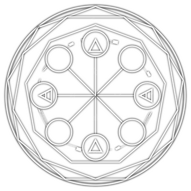 This is the first Transmutation circle I did by request. It is a healing array. Its pretty simple, but you need a philosopher's stone in order to use it (as represented by the red glob at the bottom).The septagrams are used for the healing process. The symbols to the left and right repressent healing and that symbol at the top repressents life. Now dont think for a moment that this can be used to bring someone backfrom the dead. It cant!
