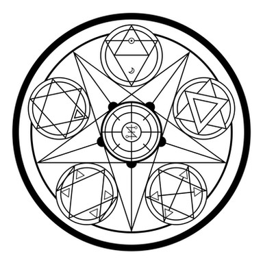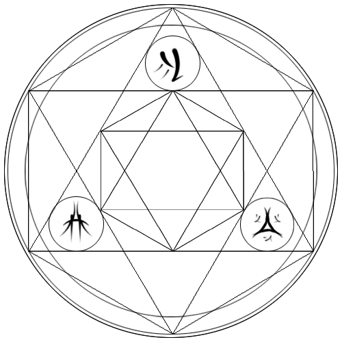 Once again, I am turning the infamous FMA alchemy into the real world alchemy. In FMA, Father was seen trying to decide who he needed to use as sacrifices to open the gate. Well he had a very interesting array, but again, I found it would not work in our form of alchemy. Well i figured it wouldn't be right if I didn't make the proper array, so I did.The shapes you see on the outside array are of my own creation. The shape is known as the Unending Pentagonal Multi-gram. Its basically infinite. The shape can be used to create a philosophers stone, affix souls to objects, create homonculi, and so much more! Its wonderful! Well these outside arrays are used to RIP the souls out of the bodies. The bodies are used as the cost to open the gate, and the highly experienced and well priced souls are the cost for entering the gate.