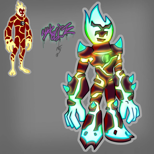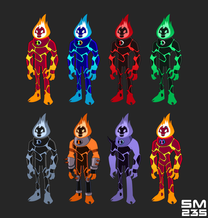 Charcoal Man's, Gwen's, Bad Ben's and Mad Ben's fire is the same color as the fire from Ben's Heatblast simply because i think it looks more natural and can actually fit in each of the Ben's aliens aesthetics, Albedo's and Benzarro's are different because of Albedo's DNA and Benzarro's Zombie Virus while Nega Ben's is different because yellow doesn't fit in his aesthetic at all.