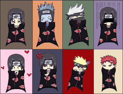 Well... Yeah, don't have much to say about this... It pretty much speaks for itself... I think. Ugh... I DESPISE the way Itachi, Zetsu, and Kakuzu came out, but whatever. It was tough to do Tobi, what with no facial features 'n' all and it was a huge pain in the ass coming up with ideas for Zetsu. Do not ask where Orochimaru is. He already has a rant and I've never even considered him part of Akatsuki to begin with(he's a bloody quitter).