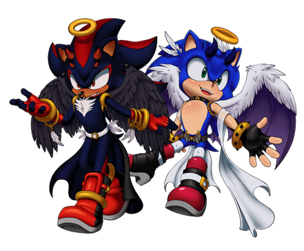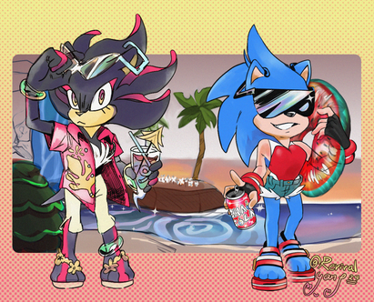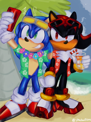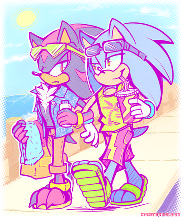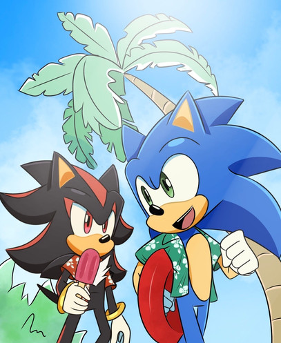I based this drawing of a Tweet I saw on Twitter. Someone edited the SA2 models of Sonic and Shadow so they have matching Hawaiian shirts and shades.I was compelled to do them for my AU bois to say the least.