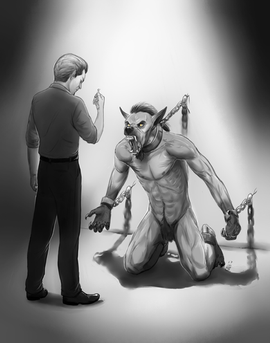 Although the moon had little infuence on the werewolf, he had decided to live in his beast form, for the remainder of his days. He had remained in this form for so long, he forgot the social codes of any human being, making him a wild and savage being.
