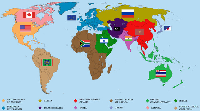 Ok well this map is based on Code Geass! [Well at least some of the flags and names are.....] Anyways here the Holy Britannian Empire conquered the world but set up special administrated zones because the capital [Phoenix, Arizona, USA] couldn't control the whole world under one leader! So they set up zones, or areas.Area 1- Holy Britannian Empire, blue, with the flag of the Holy Britannian Empire[Code Geass] , capital: Phoenix, Arizona