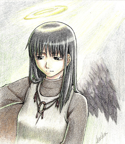 Haibane Renmei was such an incredible series. I really like the pencil work on this one, the shading and gradients are just amazing. If I tried to do anything like that without computer assistance, it would end up looking like the kind of thing your parents stick on the refridgerator when you're a little kid out of pity XD