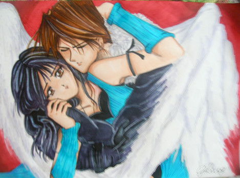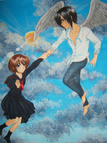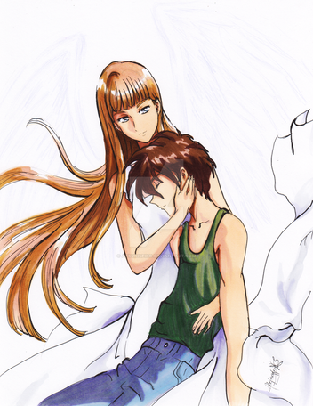 I like the way you coloured it *__* good job on the wings as well n_n Rakka and Reki look so sweet together! I love Haibane Renmei