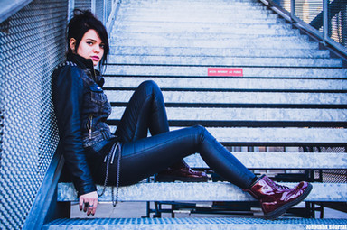 But I don't like the fact that I can't see into her eyes. Her boots are well exposed as is her jacket, but I can't see any detail on her shorts. Her legs are very white and with the fishnet stockings come out as overexposed and too high contrast. The angle of shooting make her breasts look small and oddly shaped.