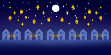 Background of some Lanterns in the sky above the clouds being seen out of a flying structure of some kind.