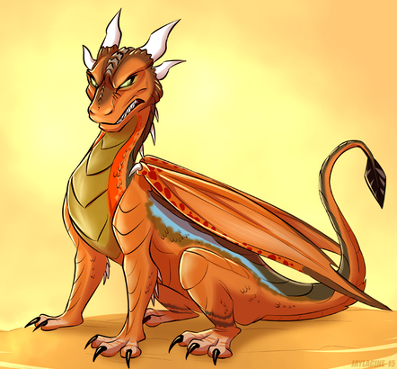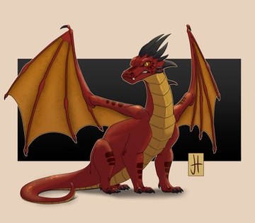 I had an fun idea for her design in my head and I really like how it turn out. I wanted to emphasize her rainwing side by giving her a long slender muzzle. I also like her spikey tail and golden strips, I think they look very niceMy only complain may be the background. It looks a little too blury, but I still like how its blue colors contrast against Peril's orange scales.