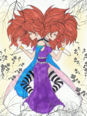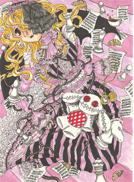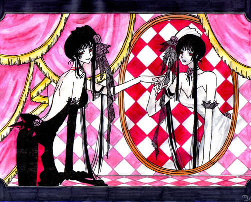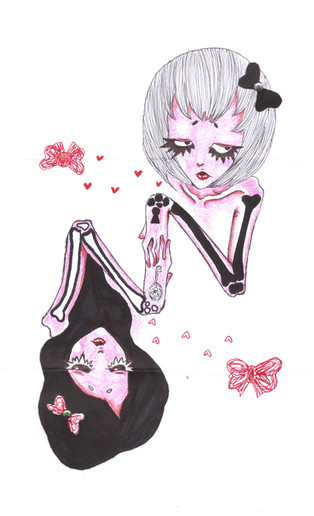 This picture is like... a year old maybe? Anyway, this is an original work from my story, "The Mask and the Mirror". It's full of subtle symbolism (wait no, more like blatant) but it might be hard to figure out what I had in mind. The full-size image is huge... beware o.oMade on 9x12 Bristol Vellum with a round pen and Prismacolor markers.