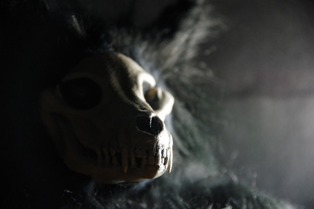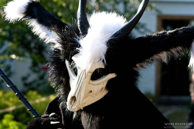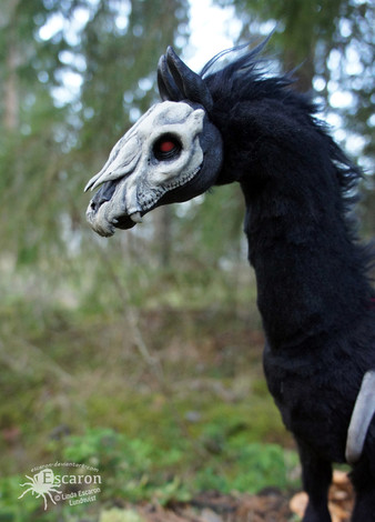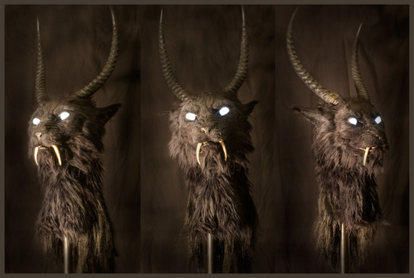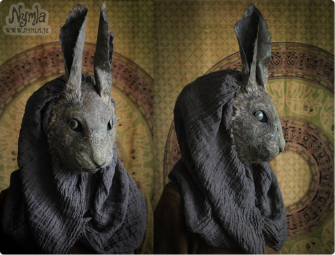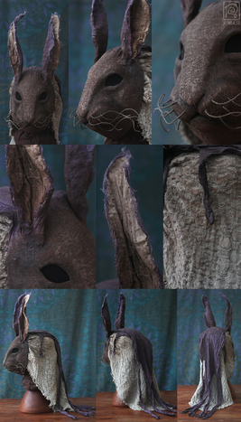 The mask is made of my own papier maché/paper clay, covered with fabrics, some faux fur, painted with acrylic paints.