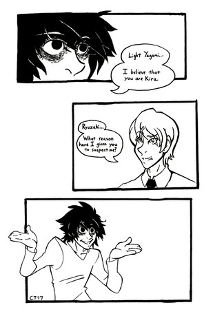 Lol! the 5th panel is what made me laugh so much....it kinda looks like a "i'm gonna rape you" face XDDD! i even laughed in the anime when light did that face! XDDDD