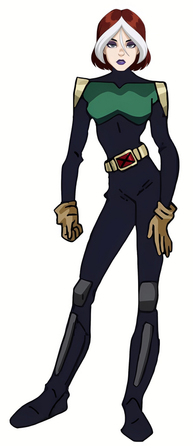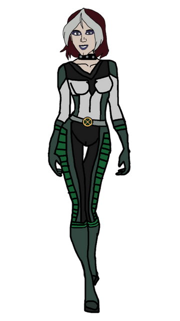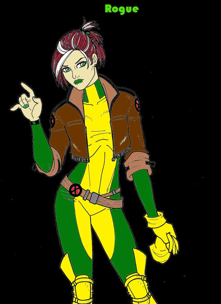 I never really liked the design for Rogue's uniform in X-men: Evolution. Now, I could make a completely different one, but that is not necessary. I decided to just do small changes to the official design. The chest plate was my main dislike, so I changed it to look more like a tank top and leeve the collar up bare - because the Rogue needs to show SOME skin. I changed the gloves simply because they did not match. The boots are tweaked some, but are still around the same structure.Overall, I like how the redesign came out. Drawing in a different style though was a freaking pain.