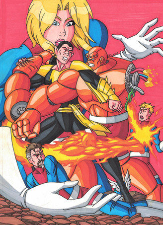 This scene kinda remind of an issue of my series Marvelous: The Man of Tungsten. The only differences of the situation is that A. Marvelous was captured by Queen Tara Rantula of the imperial planet Arachnidia. B. The Queen drugged Marvelous to a massive hypnotic stage, then raped him and became pregnant with his child. And finally C. Tara almost marry Marvelous on top of Las Vegas' Caesar's Palace only for Marvelous' love interest/partner and Grandmother to "speech now or forever hold their peace". Which led to a comedic but action packed rumble at Caesar's Palace and the rest were history.