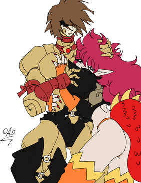 Hace mucho que no hago un dibujo de mis personajes. Tip y Bit, grandes amigos y totalmente opuestos.Tip es débil, tímido, amistoso y heroico aunque un tanto cobarde. Bit es fuerte, valiente, arrogante y un tanto cabeza hueca. Por lo que se complementan muy bien.