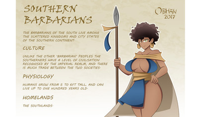 Humans are arguably the most polarizing of them all; the northern Galandrians being very old-fashioned and slow to accept new ideas, as well as being rigidly patriarchal and misogynistic, hence why many of their disgruntled peoples actually go live with high elves, many joining their foreign regiments (army regiments comprised of non-high elves, which include humans, dwarves and even orcs). By contrast the Falarnians (based on Renaissance southern Europeans) are more open-minded and arguably more advanced than Galandrians, heavily influenced by their cousins across the gulf, the Katintans. The Katintans, based on Africans, are the most advanced human civilization, even having developed cannons, all the while basing their entire social structure on their god, which is a primal lion god. As such all their warriors are women and their men are the non-combatants. Biggest contrast comes from the Amritians (based on ancient Egyptians), situated north from the Katintan nation, who are the only civilization, other than the dark elves, who openly practice necromancy. Hence everyone else scorns them, though they practice it not out of malevolence, but because it's the only way they can survive since their kingdom was sacked by the dark elves, due to one of their royalty betraying them, and when the dark elves were finally driven off, the nation was pretty much decayed, so they used the knowledge they gleamed about necromancy to compensate their once lush land becoming an arid, ever grey wasteland.