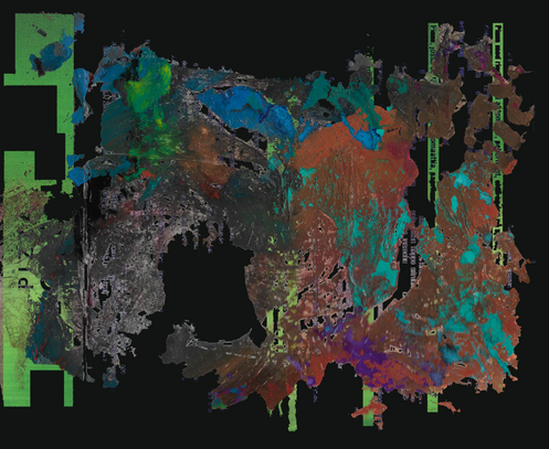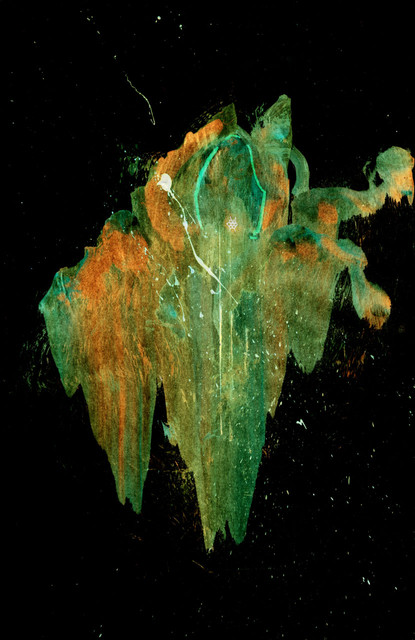 this does seem quite chaotic. i like the smaller version better, but large i can really see the texture and it look like an old hand and theres an eye in the top right corner. i like it, but i still really like you less colorful stuff.